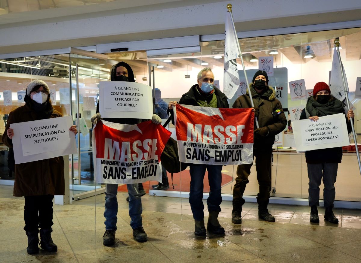 Le rassemblement s’est tenu devant les bureaux de Service Canada du complexe Guy-Favreau, à Montréal. Le 31 janvier, ce sont 300 000 dossiers qui étaient retardés par la hausse des délais de traitement et 10 000 cas bloqués en raison du piratage des systèmes informatiques de Service Canada.