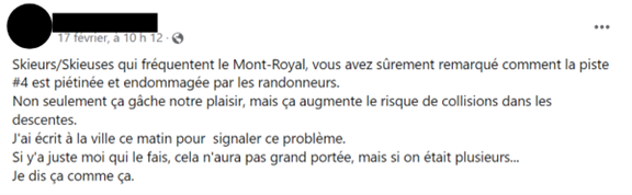 Eli Plante, entraîneuse et athlète de ski de fond depuis quinze ans, résume le problème en ces termes: «Le plus gros défi que je perçois, en dehors de la température très changeante […], c’est qu’il arrive souvent que les gens, qui en grande majorité ne sont pas là pour faire du ski de fond, marchent dans les pistes qui nous sont réservées.»