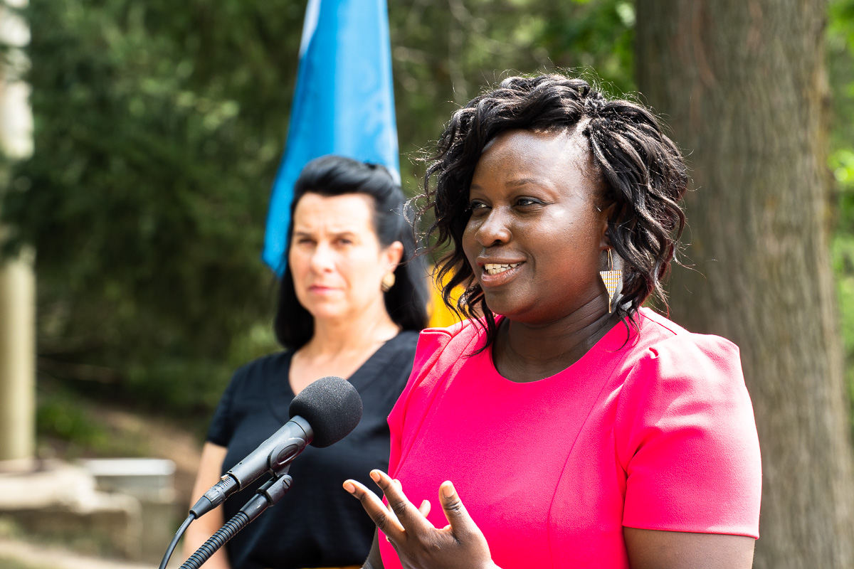 La cheffe de Projet Montréal, Valérie Plante, a présenté une équipe de candidates au Parc Martin Luther King, dont la candidate Gracia Kasoki Katahwa (sur la photo). Photo: Josie Desmarais/Métro
