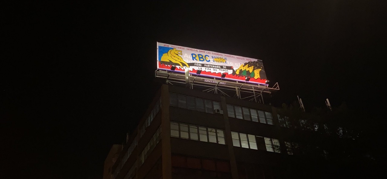 Des militants du groupe Extinction Rébellion (XR) ont déployé ce matin deux bannières sur l’autoroute 40 afin de dénoncer les agissements de la Banque Royale du Canada (RBC) dans le