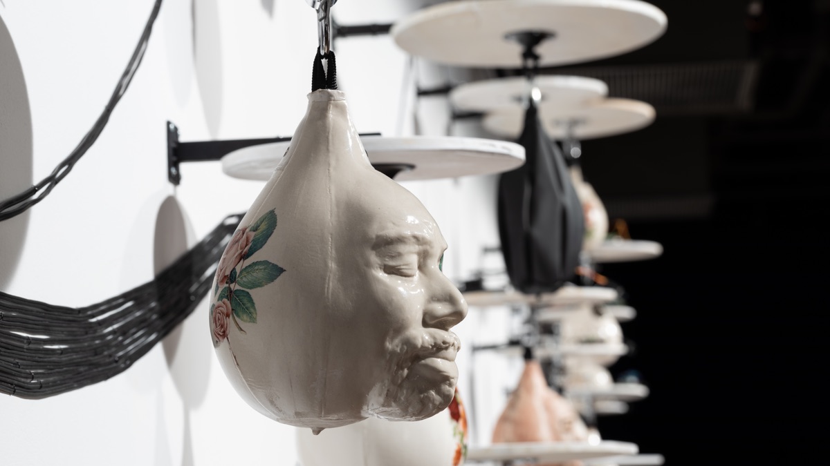 Avec l’installation interactive Punching Bags, le Montréalais d’adoption Eddy Firmin cherche à désactiver le système des violences que subissent les corps des personnes afro-descendantes. Trente punching bags en porcelaine pivotent