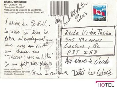 Adressées aux élèves de l’école primaire Victor-Thérien, à Lachine, les cartes n’ont jamais été postées. Elles faisaient suite à une initiative du professeur de musique Claude Robillard et de sa collègue France Lafleur, qui s’était rendue jusqu’aux oreilles de Dédé Fortin.