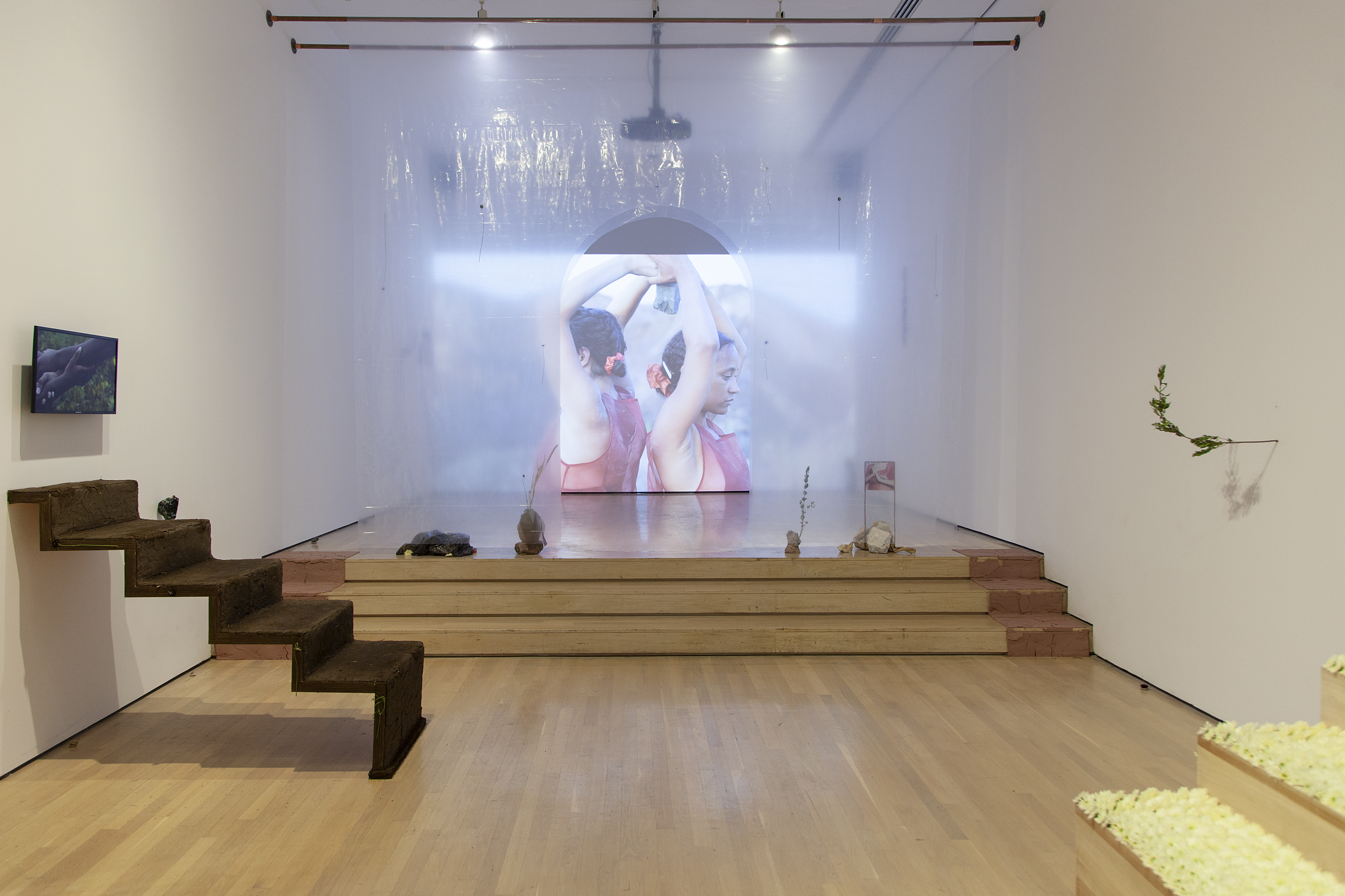 En arrivant à l’installation multidisciplinaire d’Eve Tagny nommée Gestures for a Mnemonic Garden (Gestes pour un jardin mnémonique), on se sent immédiatement comme dans un sanctuaire. Des escaliers en terreau et garnis de fleurs fraîches, des objets symboliques et une arche en rideau invitent les visiteurs au recueillement et à la commémoration.