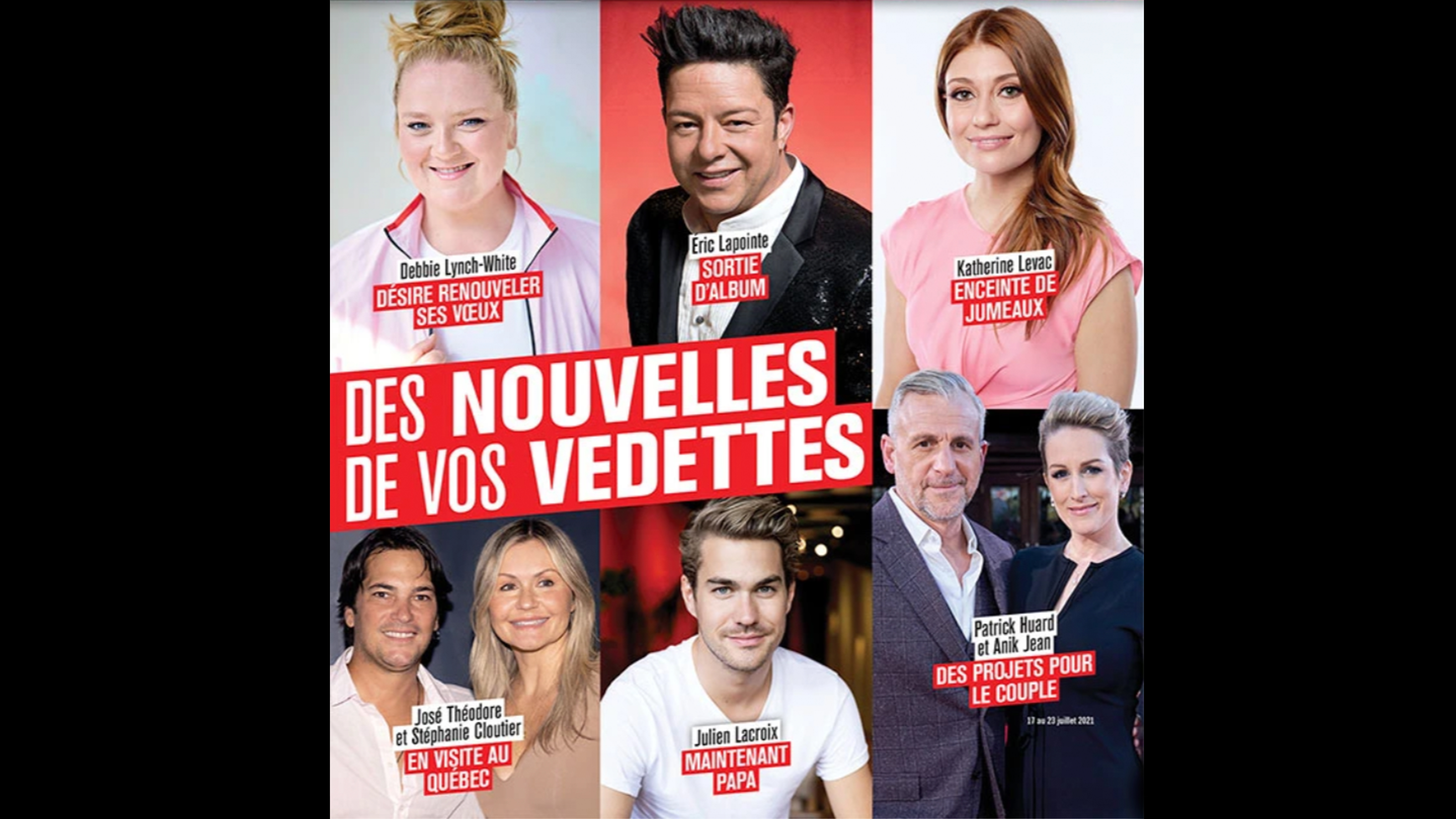 En page couverture de son édition du 17 juillet, le magazine, qui est la propriété de TVA Publications, titre «Des nouvelles de vos vedettes». En plus des deux hommes visés par des accusations d’inconduites sexuelles, s’y trouvent Katherine Levac, Mariana Mazza, Debbie Lynch-White, José Théodore, Stéphanie Cloutier, Patrick Huard et Anik Jean.