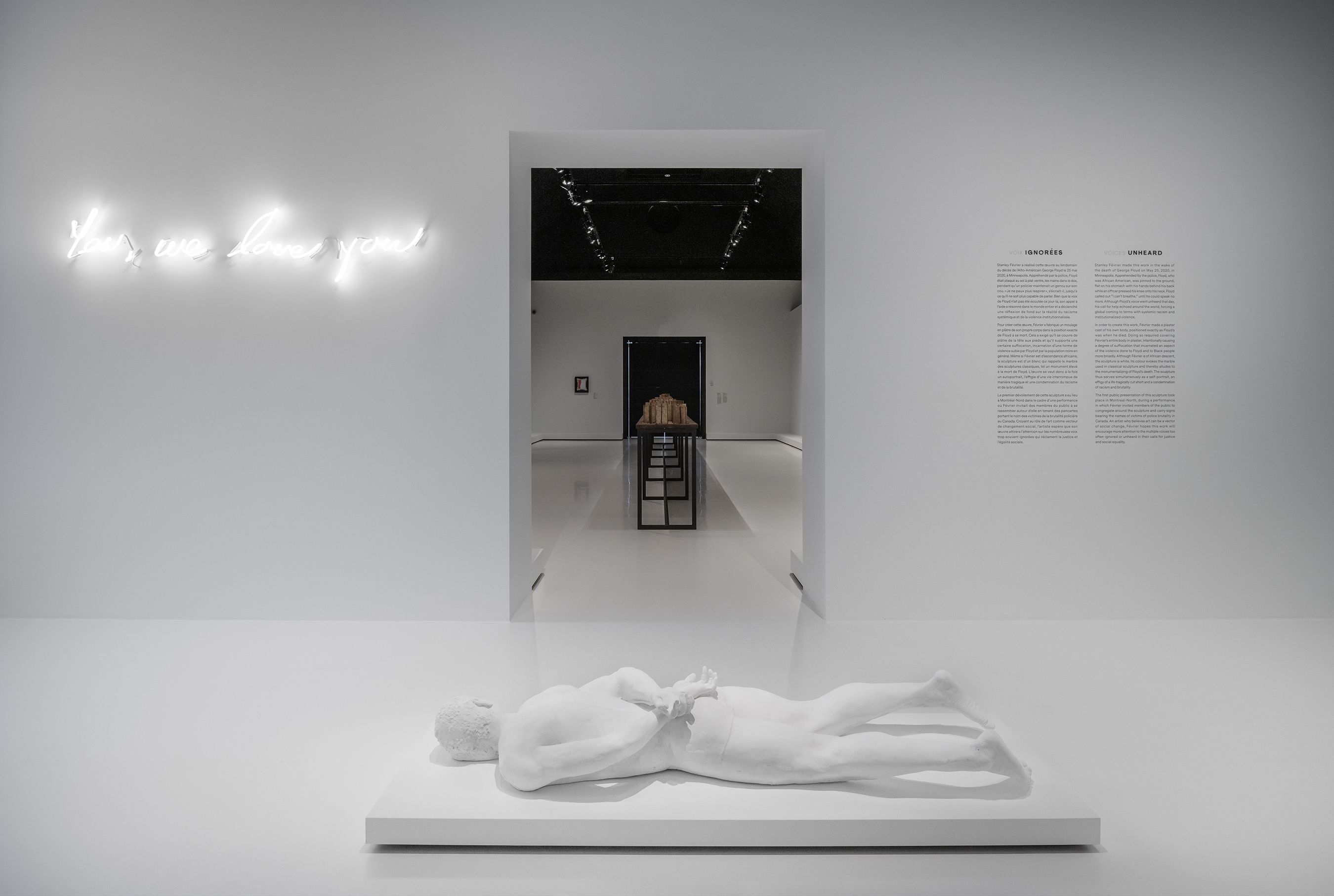 Une autre salle est entièrement consacrée à la sculpture de Stanley Février, Yes, We Love You, réalisée au lendemain de la mort de l’Afro-Américain Georges Floyd l’année dernière. Ici, l’artiste a repris la position de Georges Floyd au moment de sa mort, et a créé un moulage en plâtre. En plus de porter un message fort et de rendre hommage à cet homme, l’œuvre exprime la notion de la voix qui s’étouffe, que l’on n’entend plus.