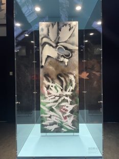 L’un des principaux attraits de ces installations est sans nul doute une œuvre inédite de Riopelle, exposée sous verre à la fin du parcours et tirée de la collection personnelle d’Huguette Vachon, sa conjointe durant la fin de sa vie. Créée sur bois en 1990, cette œuvre sans titre est représentative de la dernière phase du peintre, alors qu’il travaillait avec des pochoirs. Ici, on observe les formes de plumes, d’un filet de pêche et de carcasses d’oiseaux, fréquentes dans le travail de Riopelle.