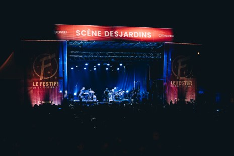 Le Festif! s’est amorcé tout en douceur avec Philippe B, qui se produisait muni de sa guitare acoustique dans une formule intimiste sur la scène Loto-Québec, recouverte de rondins et entourée d’arbres, sise dans une rue paisible. Assise sur des caissons sous un ciel voilé, la foule attentive s’est délectée de chansons tirées du plus récent album de l’artiste, Nouvelle administration, paru le printemps dernier, et d’une jolie sélection de pièces puisées dans le reste de son répertoire, telles que L’été, California Girl, L’année du serpent ou Interurbain, « anachronique aujourd’hui », rigole-t-il. « Je dois maintenant expliquer ce que c’est. » C’est avec sa « chanson la plus lente », L’amour est un fantôme — « ce qui, dans mon cas, n’est pas peu dire » — que le volubile raconteur a conclu ce moment empreint de quiétude, durant lequel l’accompagnaient sobrement la guitariste et bassiste Marie Claudel et la claviériste Ariane Bisson McLernon.