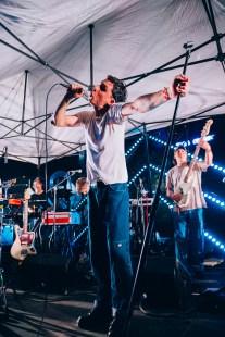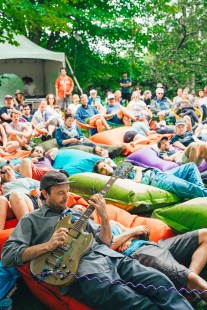 Bibi Club a joué dans la cour verdoyante d’une résidente surplombée d’arbres majestueux, ambiance intimiste propice à sa pop rêveuse. Derrière la scène, ornée de tissus blancs à textures et motifs hétéroclites, flottaient délicatement sous la brise des vêtements blancs sur une corde à linge. Avachi.e.s sur des sacs à billes ou installé.e.s sur des chaises colorées, les spectateur.trice.s ont observé à l’œuvre Adèle Trottier-Rivard et Nicolas Basque, qui ont ponctué leurs mélodies vaporeuses d’envolées instrumentales plus mordantes mettant en valeur la guitare électrique du membre de Plants and Animals. Le duo, couple dans la vie, a offert une finale décapante sur Le soleil et la mer, Adèle rossant sa cymbale et Nicolas faisant rugir sa guitare. « J’espère que la musique vous accompagne comme il se doit », dira en cours de route la chanteuse, percussionniste et claviériste. Un moment magique, typiquement Festif!