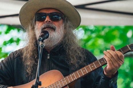 On a entendu frapper de façon impromptue au 121, rue Sainte-Anne… et c’était Michel Pagliaro! Sous un arbre majestueux, Pag a offert une prestation dépouillée à la guitare acoustique, ce qui ne l’a pas empêché de rocker, dans une ambiance parfois bluesy, aux côtés d’un ami guitariste. Le vétéran à la crinière ondulée coiffé d’un chapeau a enchaîné les succès J’entends frapper, L’espion, Dangereux, Louise, Fou de toi, Émeute dans la prison et autres Les bombes. Alors qu’il entonnait Rainshowers, une fine pluie s’est mise à tomber dans un ciel dégagé, la lumière du début de soirée transperçant le feuillage, comme scintillant. « C’était un grand plaisir de jouer sous le soleil pour vous », a-t-il chaleureusement dit à son public. Un moment d’une grande beauté avec un grand du rock.