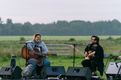 Le plus récent album de Safia Nolin, SEUM, se décline en deux versions : sunset et sunrise. C’est dire combien l’œuvre de l’autrice-compositrice-interprète se destinait à l’emblématique concert à l’aurore du Festif! C’est au son des oiseaux et de la voix soyeuse de Safia, qui a également puisé dans le répertoire de ses albums précédents Dans le noir et Limoilou, que les festivalier.ère.s se sont éveillé.e.s doucement… ou ont conclu leur nuit blanche. « C’est facile de voir qui n’a pas dormi, no judgment », a pouffé la guitariste, accompagnée de son ami Marc-André Labelle à la guitare électrique. « Je me sens mal de parler fort, je veux pas déranger les vaches », a-t-elle susurré en introduction. Safia a beau créer des chansons tristes, comme elle le dit elle-même, elle est une farceuse invétérée peinant à parler sans badiner, devant se ramener elle-même à l’ordre. « C’est vrai, on est ici pour faire un show », s’est-elle esclaffée entre deux anecdotes liées au Pacini et au mush. « Je suis donc bien de bonne humeur ce matin! » Elle a sans conteste amorcé notre journée du bon pied.