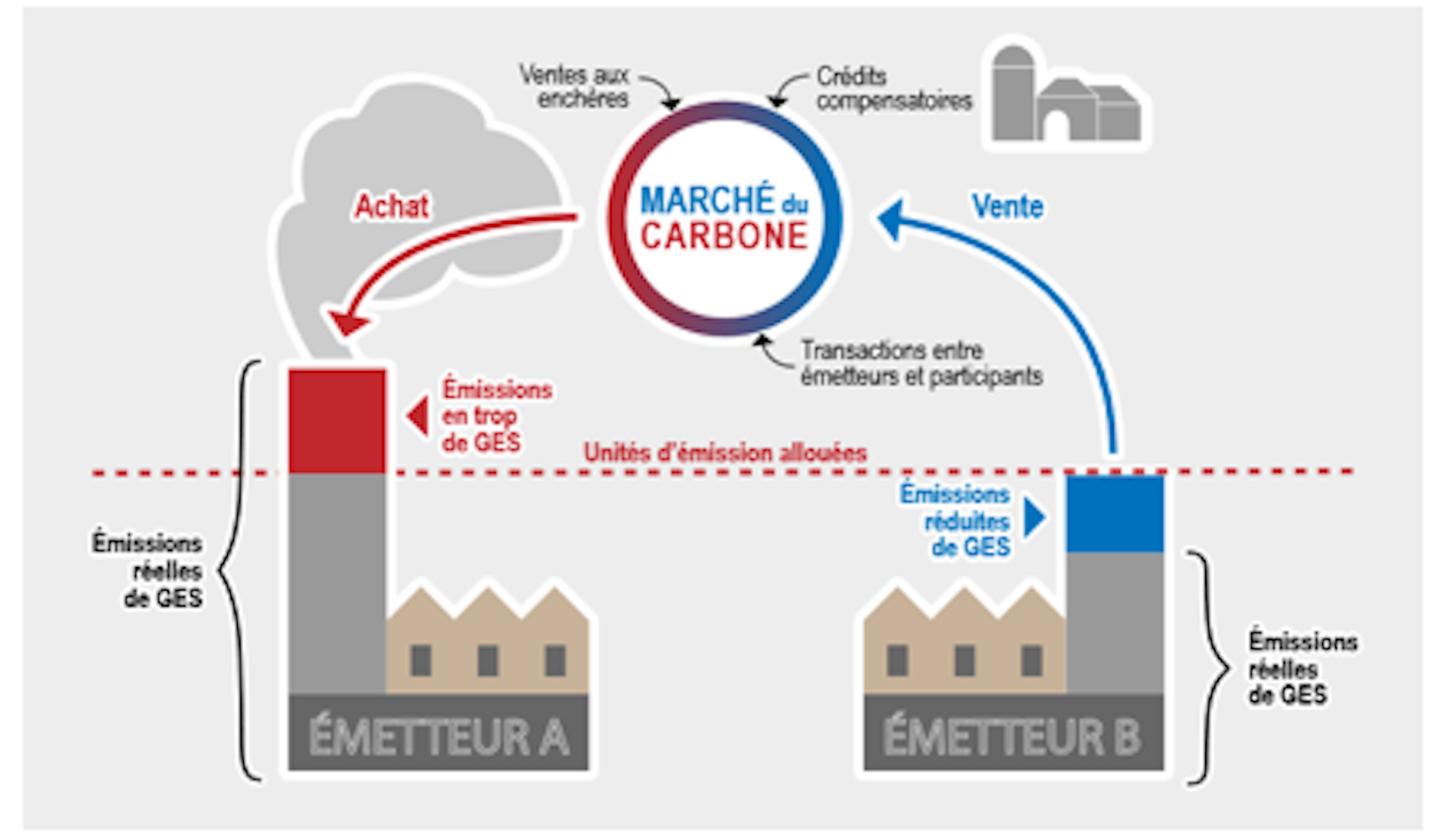 Plusieurs provinces, dont le Québec, se sont dotées d’un marché du carbone. Le gouvernement provincial fixe un plafond pour les émissions pour certains secteurs pollueurs en fonction de ses objectifs de réduction de GES. Chaque entreprise assujettie obtient un nombre d’unités d’émissions qui lui sont allouées (correspondant au plafond fixé). Lorsque ses émissions réelles dépassent les unités allouées, l’entreprise doit acheter des unités supplémentaires sur le marché du carbone, correspondant aux unités d’émissions en trop. Au contraire, lorsque ses émissions sont inférieures aux unités allouées, l’entreprise pourra vendre les unités d’émissions réduites sur le marché du carbone.