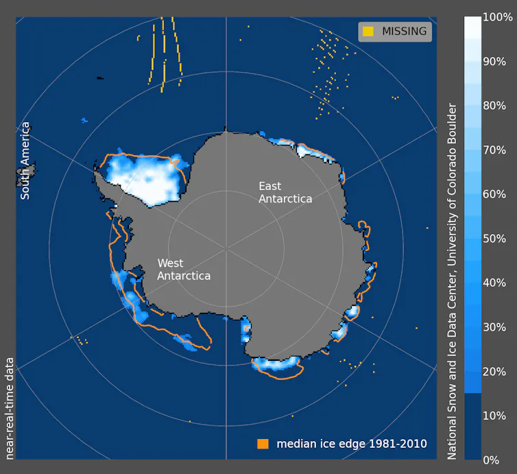 Concentration de glace de mer antarctique le 13 février. La ligne orange représente l’étendue médiane de la glace de mer correspondante à la période 1981-2010. Image fournie par le National Snow and Ice Data Center, University of Colorado, Boulder (NSIDC).