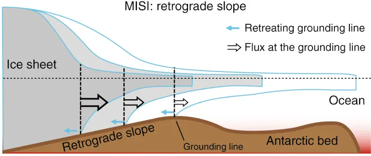 Le mécanisme qui expliquerait ce retrait instable est connu sous le nom d’« instabilité de la calotte glaciaire marine ». Si le substrat rocheux sur lequel se repose la calotte glaciaire marine est en pente vers l’intérieur, la position de la ligne d’échouage (zone à partir de laquelle la glace, qui repose sur le substrat rocheux, commence à flotter) est instable. En effet, l’amincissement de la plate-forme de glace cause le retrait de la ligne d’échouage, ce qui mène à une augmentation du flux de glace de la calotte glaciaire vers la mer, et, subséquemment, à l’amincissement de la plate-forme de glace. Et ainsi de suite.