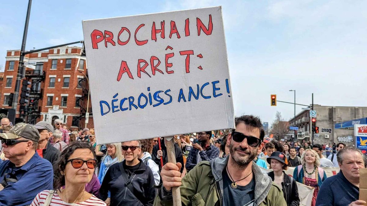 «Prochain arrêt : décroissance», peut-on lire sur la pancarte d’un citoyen engagé. Le mot était aussi sur les lèvres de plusieurs autres manifestants. En opposition au principe de développement économique, même au développement durable, la décroissance est une idée qui avance que pour avoir une chance de réussir la transition écologique, il faut réduire notre économie plutôt que de continuer à viser l’augmentation de notre production et de notre richesse, même si elle se fait de manière soi-disant responsable. «Le développement durable n’est pas durable», nous dit le citoyen à la pancarte. Une perspective partagée par la MPACQ, la SITT, le Réseau des femmes en environnement et plusieurs autres citoyens.