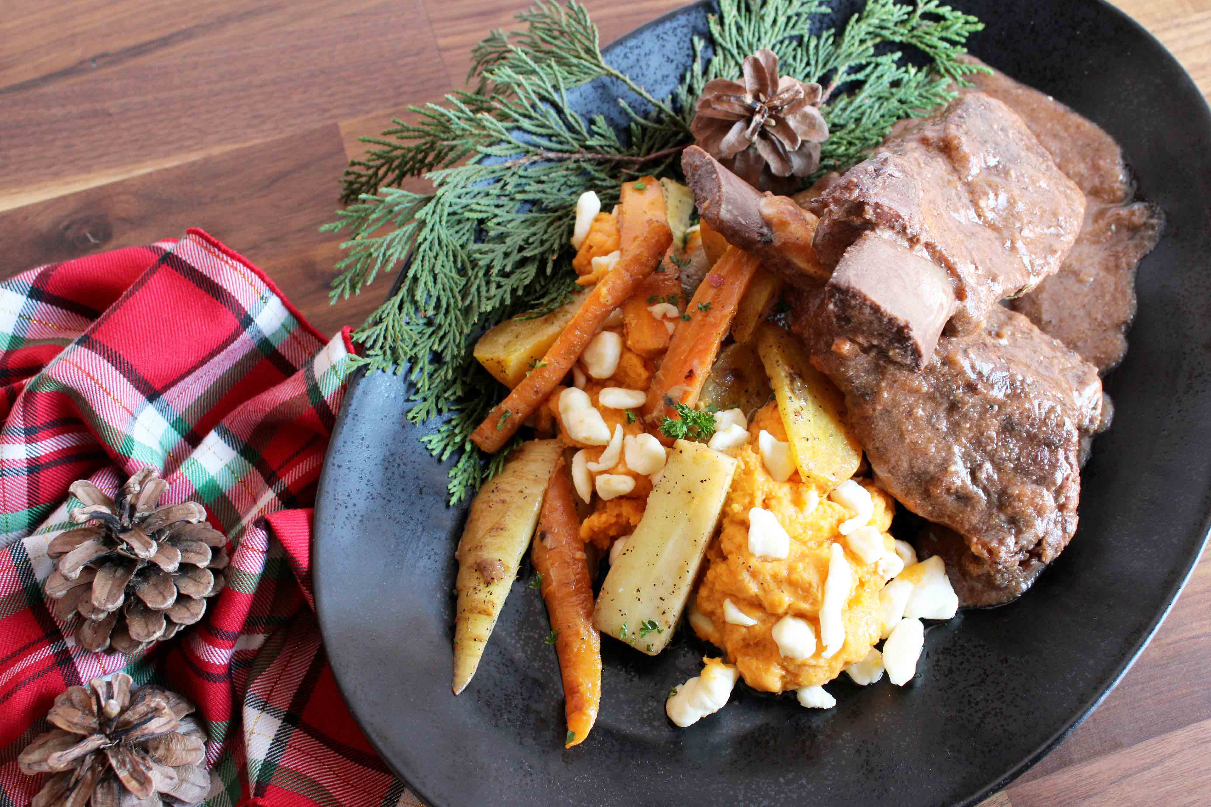 - Côte courte de Bœuf braisé en cuisson lente, légumes racines rôti et écrasé de pommes de terre douces, crotte de fromage et noix de muscade.