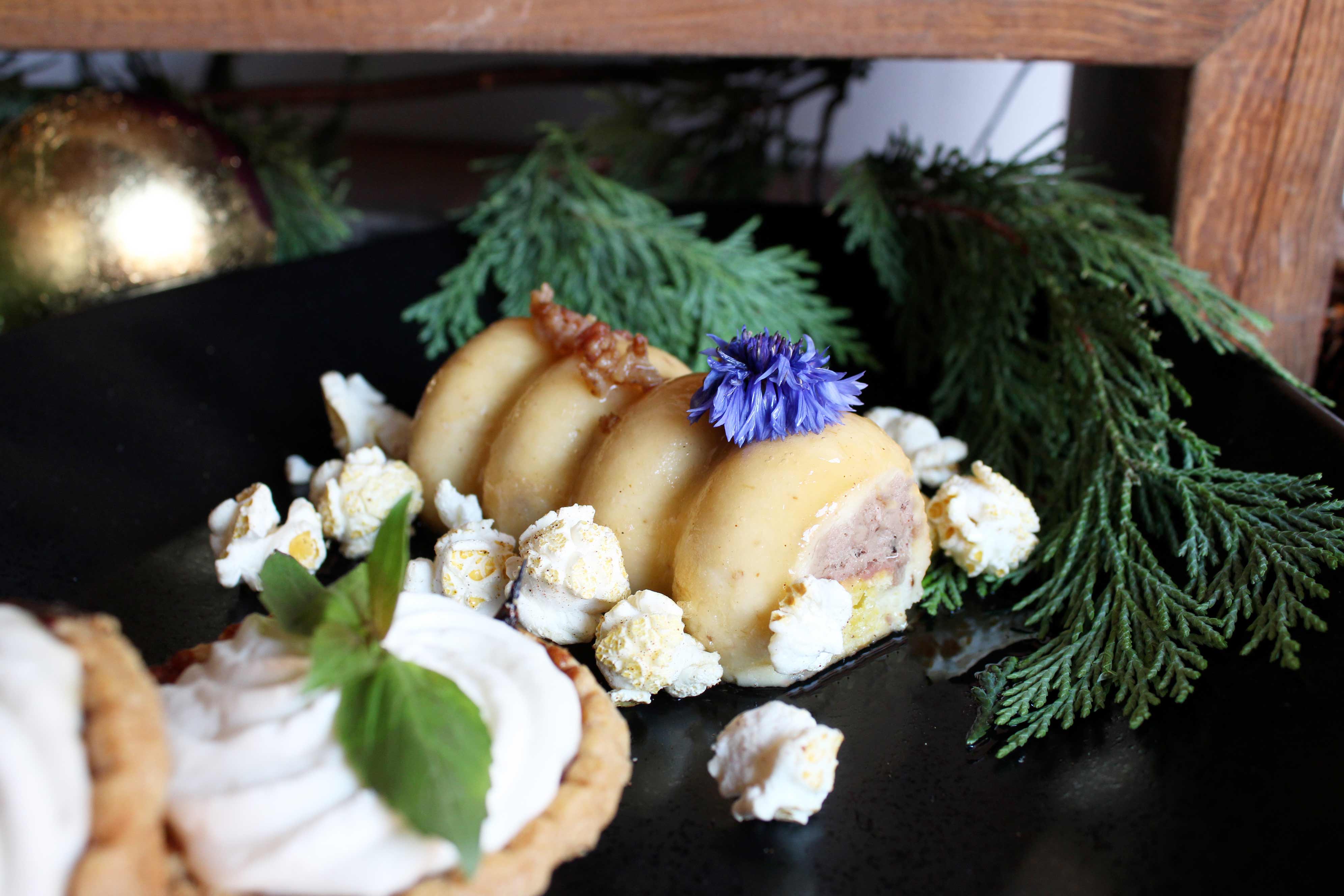 - Bûche de Noël de magret de canard, confit d’oignons, pain de maïs, popcorn épicé et son crumble de bacon
