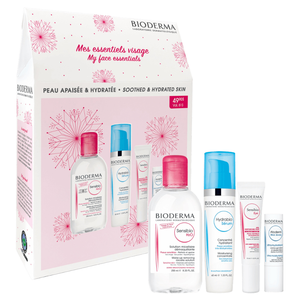 Très connus des adolescents, les quatre soins offerts dans le coffret Essentiels Visage de Bioderma conviennent aux peaux sensibles, délicates et capricieuses. Le sensibio H2O nettoie et démaquille, l’hydrabio sérum lisse la peau et lui redonne de l’éclat, le sensibio gel contour des yeux réduit les poches et décongestionne alors que l’Atoderm stick lèvres répare et protèges les lèvres abîmées.