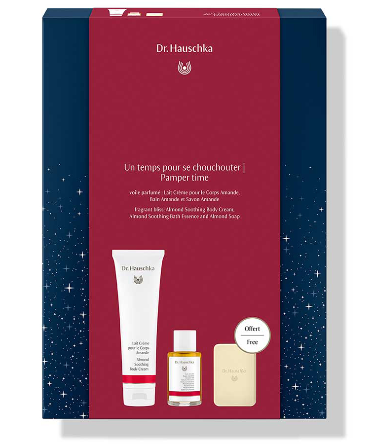 Le kit cadeau Dr Hauschka «Un Temps pour se Chouchouter», permettra à celui qui le reçoit d’apprécier le parfum des délicates fleurs d’amande et d’oublier ainsi les heures sombres des jours d’hiver. Le kit cadeau contient le Lait Crème pour le Corps Amande, une édition limitée du Bain Amande et une autre édition limitée de savon aux amandes.