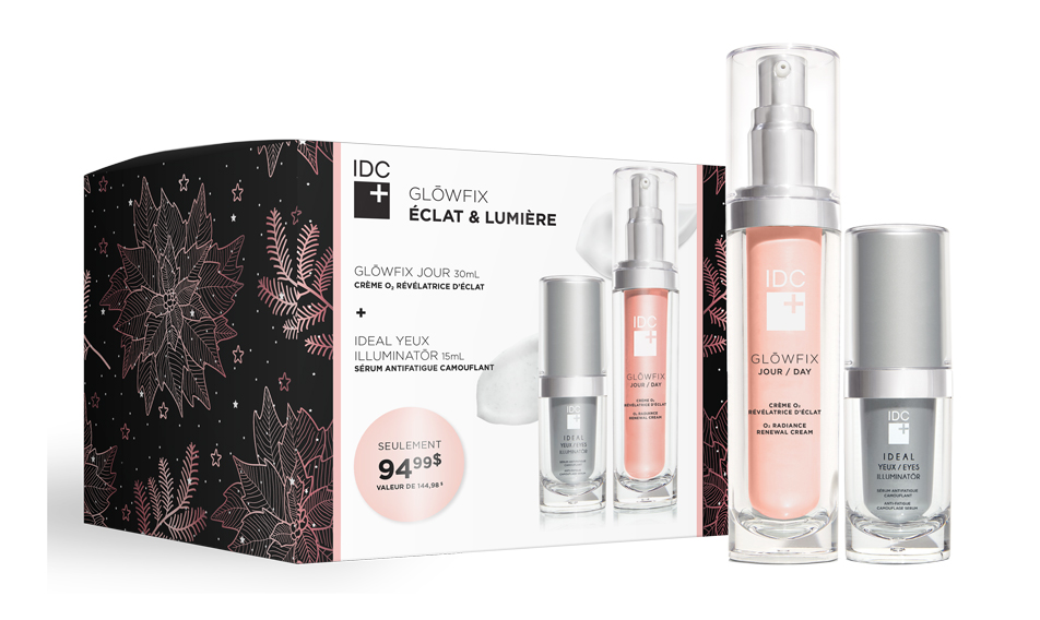 Le coffret Glowfix Éclat & Lumière, de la marque québécoise IDC Dermo, contient des soins qui transforment instantanément la peau en lui donnant une apparence illuminée et radieuse. Il s’agit de la crème O2 révélatrice d’éclat GLOWFIX Jour et le sérum antifatigue camouflant IDEAL Yeux Illuminator.