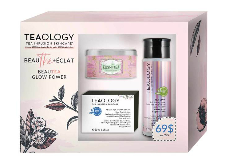 Dans ce coffret-beauté, le thé est à l’honneur! La marque Teaology propose un rituel beauté comprenant deux produits: le tea glow, un exfoliant fait d’infusion de thé vert et le peach tea hydra cream, un hydratant réalisé à base d’infusion de thé bleu. Le coffret inclut également un thé de la marque Kusmi pour en délecter une tasse pendant votre rituel.