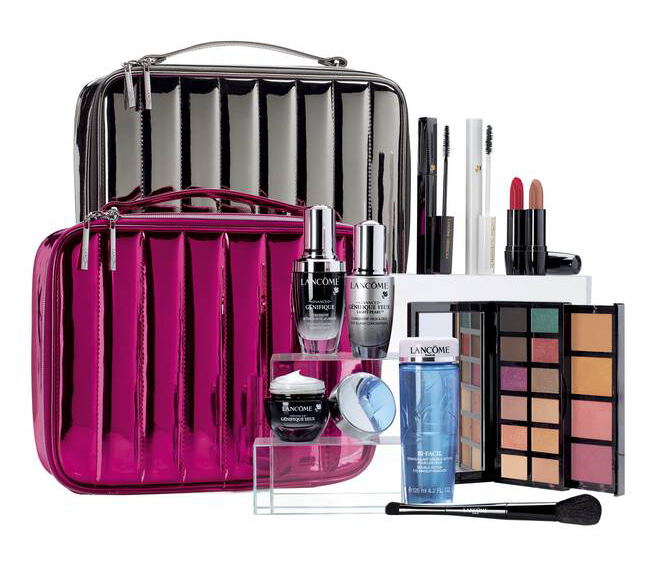 La boîte beauté des fêtes Lancôme contient 10 produits vedettes en format régulier. Vous pouvez choisir entre une trousse de maquillage rose ou chrome. Voici ce qu’on y trouve: