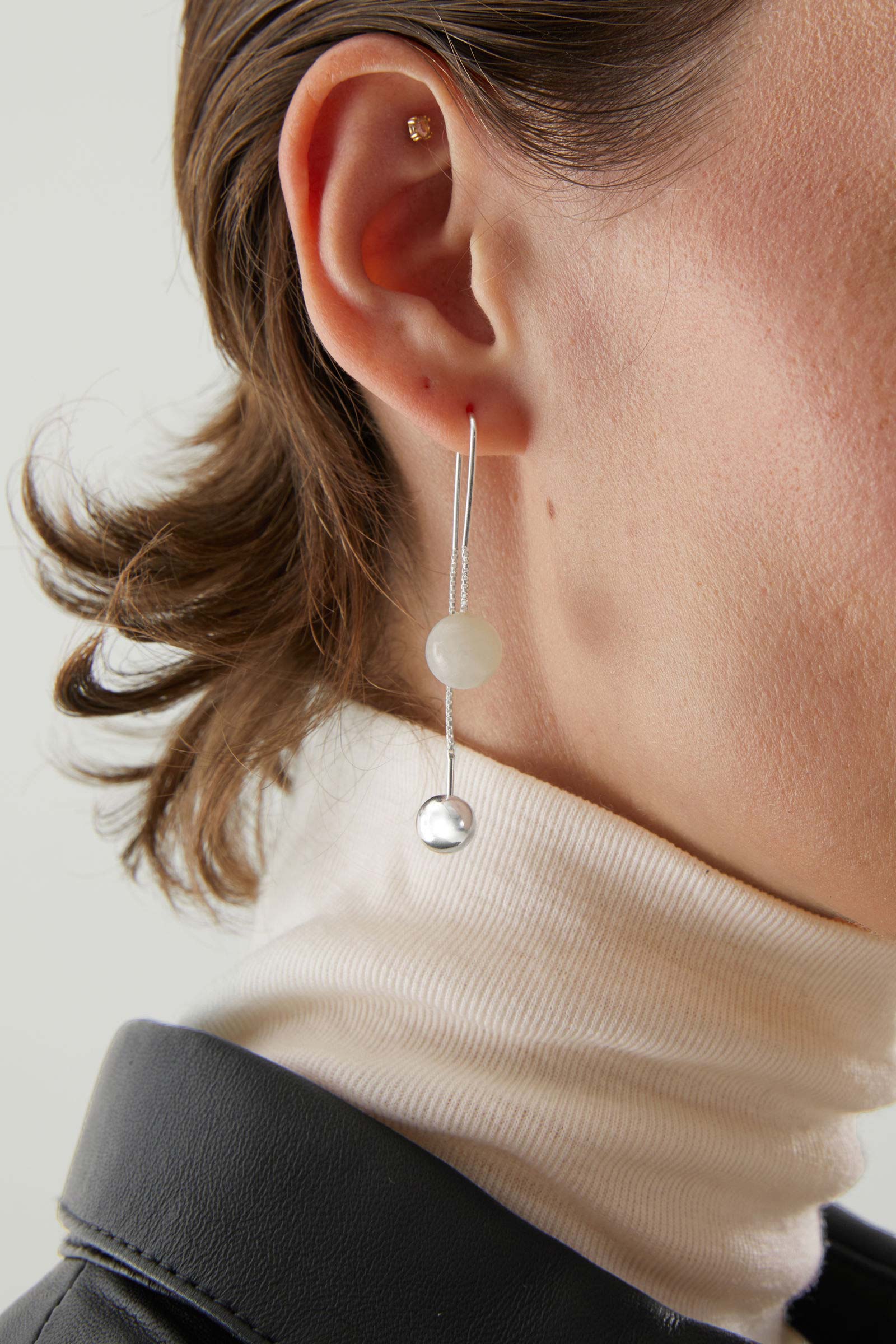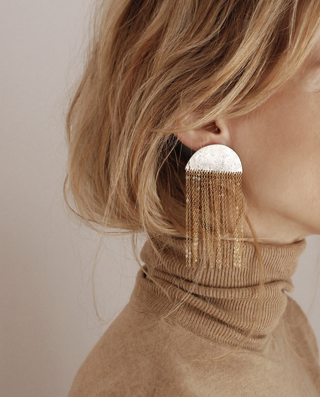 Faisant partie de la collection de bijoux recyclés de la marque COS, ces boucles d’oreilles sont fabriquées en argent sterling recyclé, et sont dotées d’une boule de pierre de quartz fumée semi-précieuse amovible qui se dévisse pour révéler un fil métallique qui peut être poussé à travers le lobe. Raffinées!