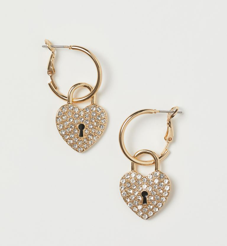 La collection Conscious de H&M propose des bijoux fabriqués à partir de matériaux issus de sources durables et provenant de déchets normalement jetés. Le zinc (60%) contenu dans cette paire de fins anneaux en métal avec cadenas en forme de cœur parsemé de pierres du Rhin est d’origine recyclée.