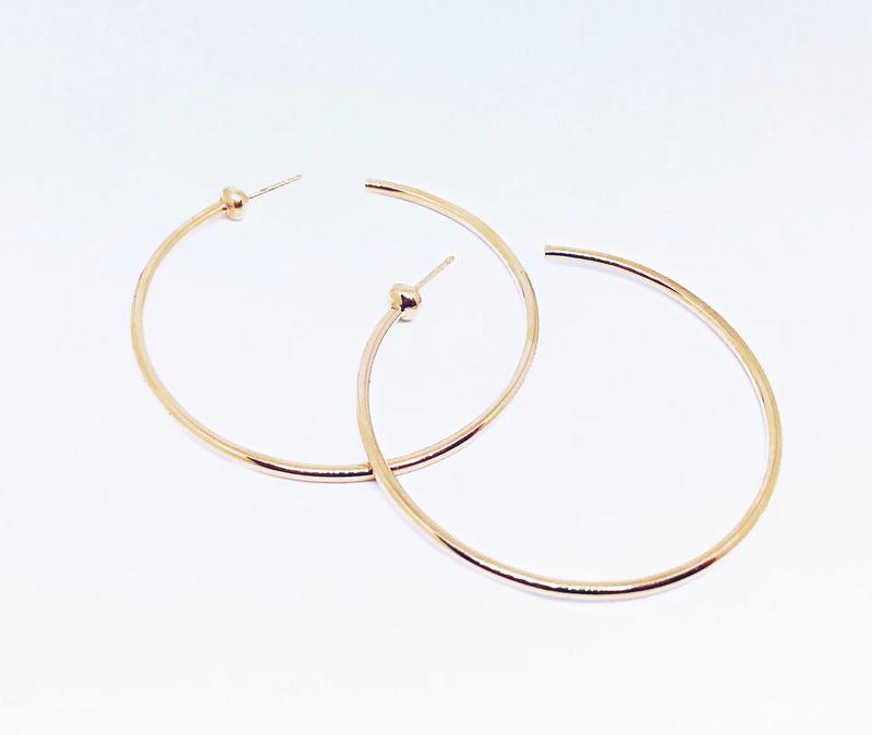 La jeune joaillière Sarah Simard s’est donné comme mission d’offrir des bijoux classiques et intemporels faits à la main à Montréal. Cette paire d’anneaux est un classique que toutes femmes doivent avoir dans leur coffre à bijoux! Plaqués en or 14 carats, les anneaux ont un diamètre de 5,5 cm; parfaits pour tous les styles et occasions!
