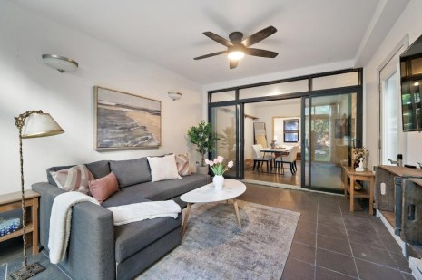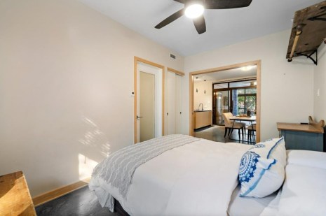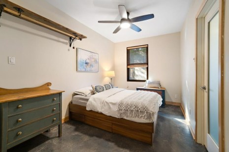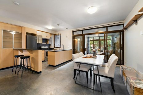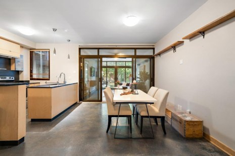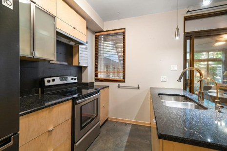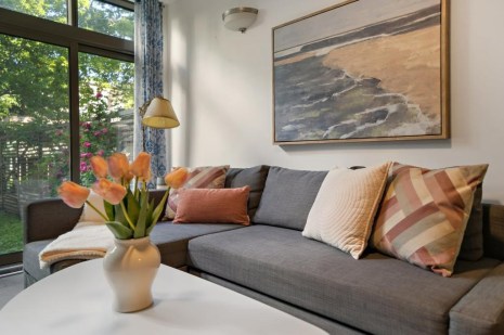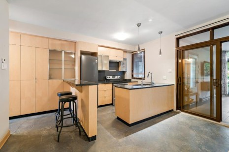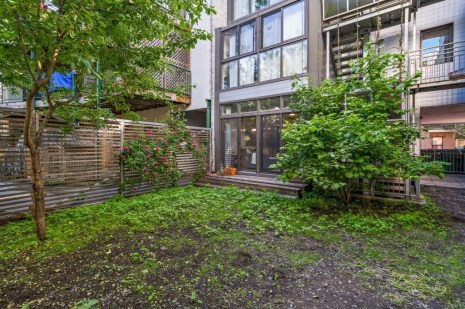 Dans la cuisine qui est aussi une salle à manger, les rangements en bois clair contrastent avec le plancher de béton gris foncé. Le salon attenant s’apparente presque à une véranda tant les fenêtres généreuses laissent entrer la lumière. Il donne d’ailleurs directement sur un petit jardin individuel qui donne aussi accès à une cour partagée. La chambre et la salle de bain sont aussi joliment aménagées, dans un style minimaliste.