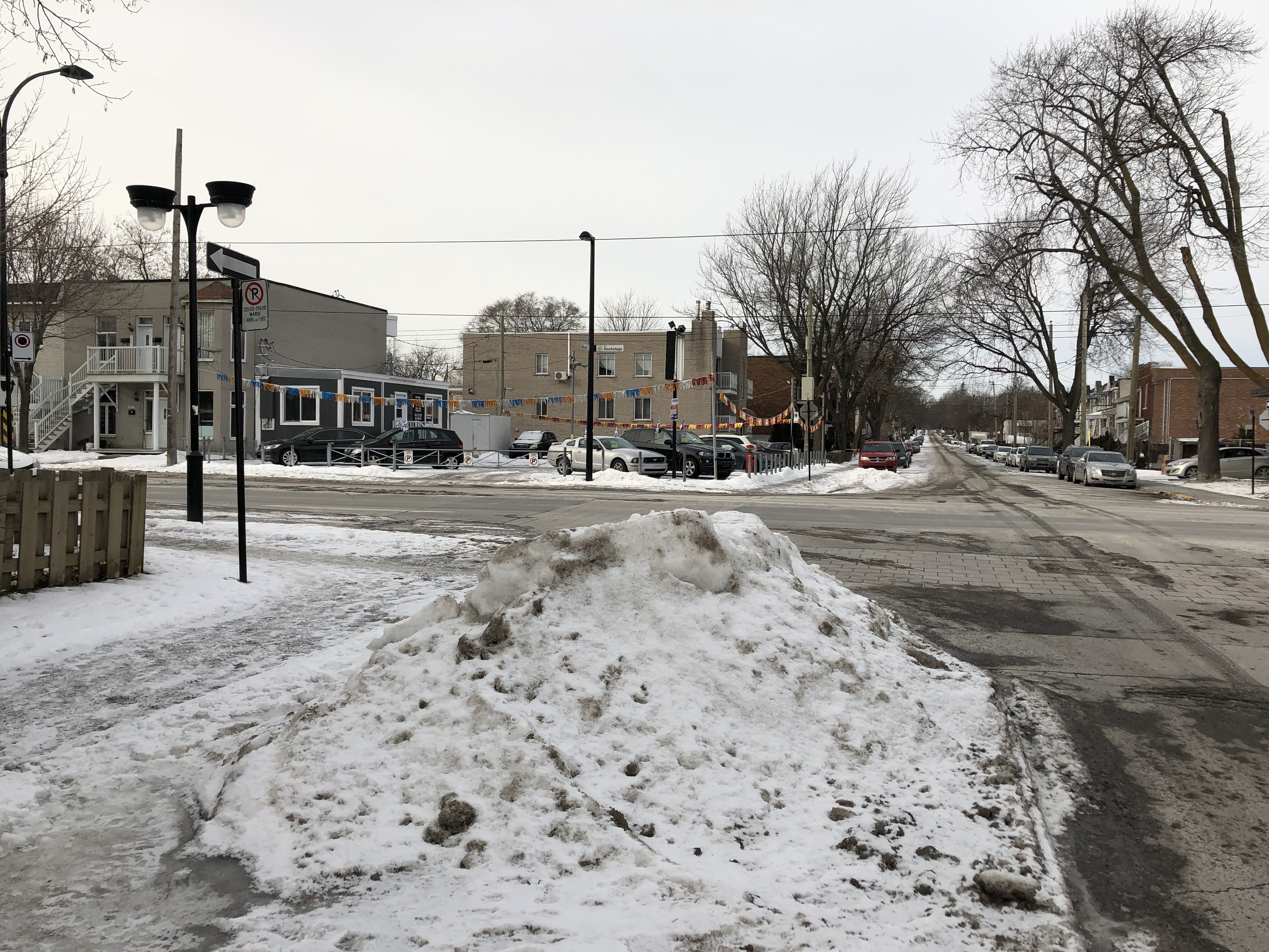 Vraisemblablement entreposés par des déneigeurs privés, les amonts de neiges ont pris place le long des bandes jaunes interdisant le stationnement afin de dégager la visibilité pour les voitures.