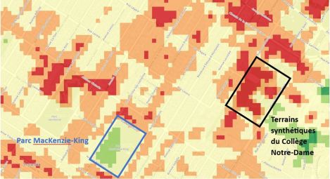 Côte-des-Neiges souffre d’un déficit d’infrastructures sportives et d’espaces verts après avoir été négligé pendant des décennies, souligne-t-elle. Le seul terrain synthétique du quartier, celui du parc Martin-Luther-King, ne permettrait pas de répondre à la demande. Le futur terrain du parc Mackenzie-King permettra 90 heures de jeu supplémentaires par semaine, soutient l’Arrondissement.