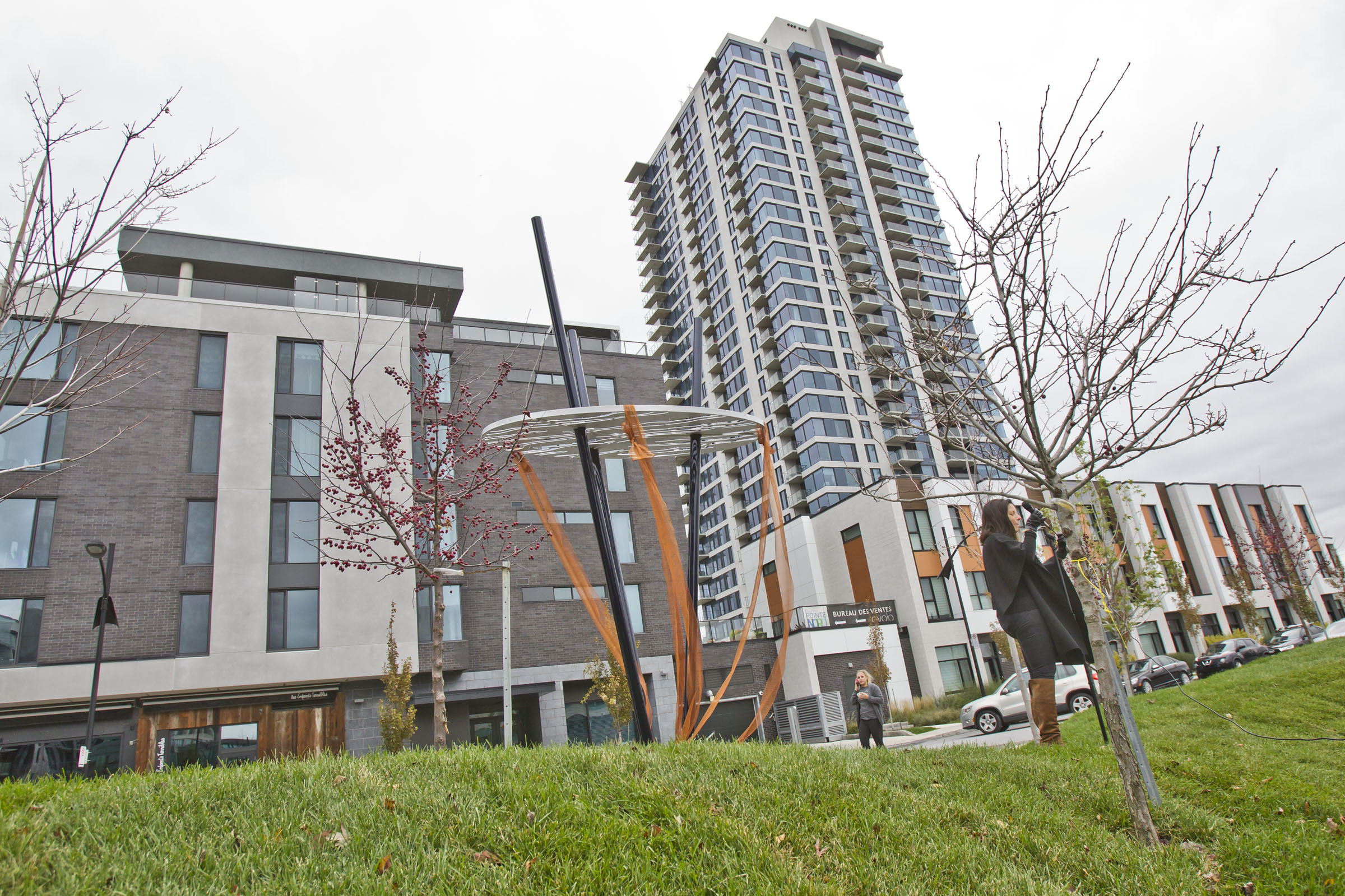 «Mon mandat, c’était de définir le square devant la nouvelle tour Evolo X. Le promoteur Samuel Gewurz voulait qu’il y ait des sculptures, mais on voulait qu’il y ait une interaction dynamique avec l’œuvre et que ça soit utile. Il a finalement suggéré le travail de Linda», indique l’architecte-paysagiste de la firme Robitaille & Curtis, Sophie Robitaille.