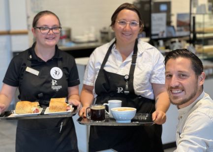 Roxane et Alyssa, de la boulangerie Première Moisson, se sont empressées de servir le Verdunois Bruno Zara, un nouveau diplômé en photographie du CFP Verdun.