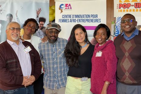 Ensemble, à la table de JENAP et du Centre innovation pour femmes afro-entrepreneures: le coordonnateur Noureddine Razik, l’intervenante Félicia-Esther, Fedrique Pierre, Andrea Serrano, Fatimata Kienou et Ango Mabolia.
