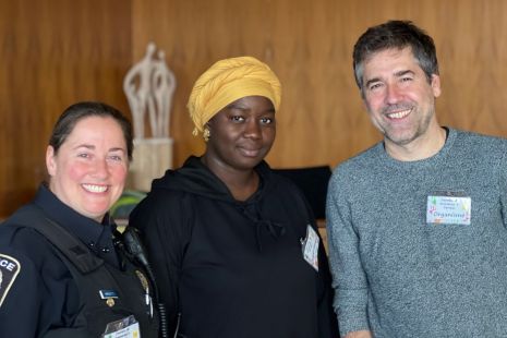 L’agent sociocommunautaire Sophie Morissette en compagnie de Du Mou Diakite, de la Maison des familles de Verdun, et Stéphane Trudel, du CPE les Trottinettes.