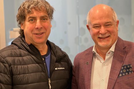 Marc Vézina, le président d’Outdoor Team Canada (à gauche), dont les bureaux et l’entrepôt sont situés à L’Île-des-Sœurs, a profité de sa rencontre avec Louis Vanier de la Caisse Desjardins pour faire la promotion des skis Kastle, dont il est un distributeur.