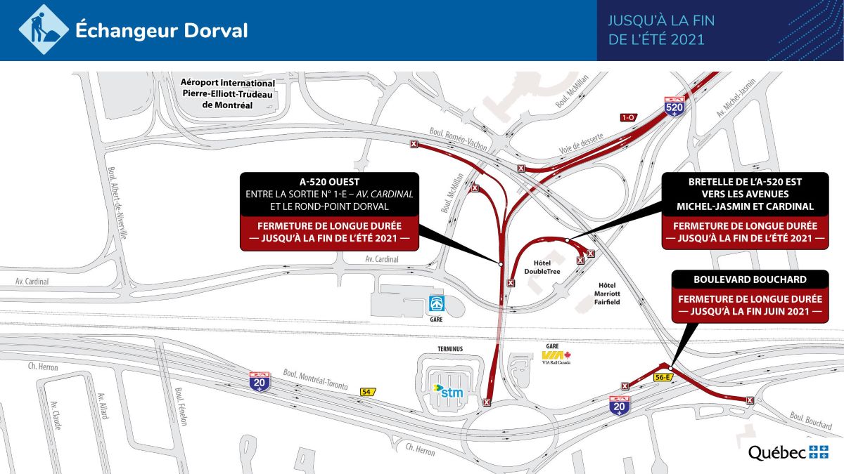 | Fermetures · Sortie no1-O — aéroport international Pierre-Elliott-Trudeau · Bretelle menant au boulevard Roméo-Vachon à l’autoroute 520 en direction ouest · Bretelle menant du boulevard McMillan à l’autoroute 520 en direction ouest · Bretelle menant de l’autoroute 520 en direction est aux avenues Michel-Jasmin et Cardinal |