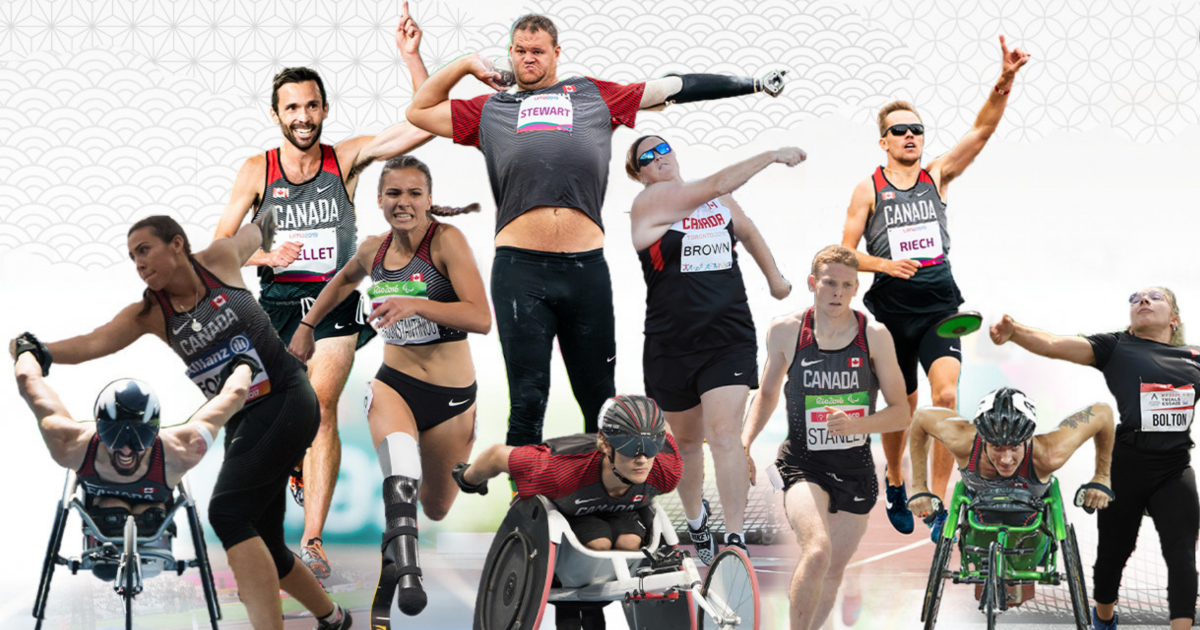 | Équipe de para-athlétisme de Tokyo 2020 Charlotte Bolton de Tillsonburg, Ontario – lancer du poids, disque(F41) Jennifer Brown de Calgary, Alberta – lancer du disque (F38) Renee Foessel d’Orangeville, Ontario – lancer du disque (F38) Jessica Frotten de Whitehorse, Yukon – 100, 400, 800, 1500, 5000 et 4 x 100 mètres relais universel (T53) Zachary Gingras de Markham, Ontario – 400 et 4 x 100 mètres relais universel (T38) Austin Ingram de Petawawa, Ontario – 100 et 4 x 100 mètres relais universel (T13) Brent Lakatos de Dorval, Québec – 100, 400, 800, 1500, 5000 mètres et marathon (T53) Sarah Mickey de Redcliff, Alberta – lancer du disque (F55) Thomas Normandeau de Peace River, Alberta – 400 mètres (T47) Guillaume Ouellet de Victoriaville, Québec – 5000 mètres (T13) Marissa Papaconstantinou de Tortonto, Ontario – 100, 200 et 4 x 100 mètres relais universel (T64) Nate Riech de Victoria, Colombie-Britannique – 1500 mètres (T38) Austin Smeenk de Oakville, Ontario – 100 et 800 mètres (T34) Liam Stanley de Victoria, Colombie-Britannique – 1500 mètres (T37) Greg Stewart de Kamloops, Colombie-Britannique – lancer du poids (F46) Amy Watt de Victoria, Colombie-Britannique – saut en longueur (T47) |