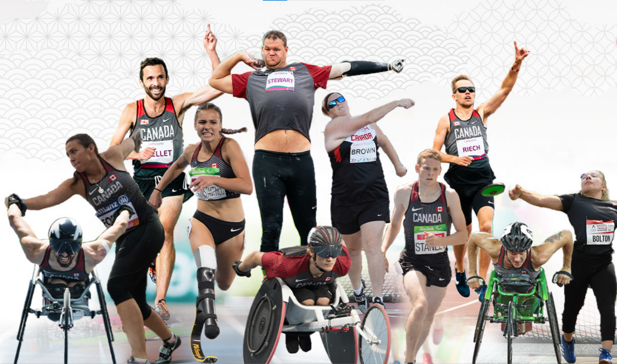 | Équipe de para-athlétisme de Tokyo 2020 Charlotte Bolton de Tillsonburg, Ontario – lancer du poids, disque(F41) Jennifer Brown de Calgary, Alberta – lancer du disque (F38) Renee Foessel d’Orangeville, Ontario – lancer du disque (F38) Jessica Frotten de Whitehorse, Yukon – 100, 400, 800, 1500, 5000 et 4 x 100 mètres relais universel (T53) Zachary Gingras de Markham, Ontario – 400 et 4 x 100 mètres relais universel (T38) Austin Ingram de Petawawa, Ontario – 100 et 4 x 100 mètres relais universel (T13) Brent Lakatos de Dorval, Québec – 100, 400, 800, 1500, 5000 mètres et marathon (T53) Sarah Mickey de Redcliff, Alberta – lancer du disque (F55) Thomas Normandeau de Peace River, Alberta – 400 mètres (T47) Guillaume Ouellet de Victoriaville, Québec – 5000 mètres (T13) Marissa Papaconstantinou de Tortonto, Ontario – 100, 200 et 4 x 100 mètres relais universel (T64) Nate Riech de Victoria, Colombie-Britannique – 1500 mètres (T38) Austin Smeenk de Oakville, Ontario – 100 et 800 mètres (T34) Liam Stanley de Victoria, Colombie-Britannique – 1500 mètres (T37) Greg Stewart de Kamloops, Colombie-Britannique – lancer du poids (F46) Amy Watt de Victoria, Colombie-Britannique – saut en longueur (T47) |