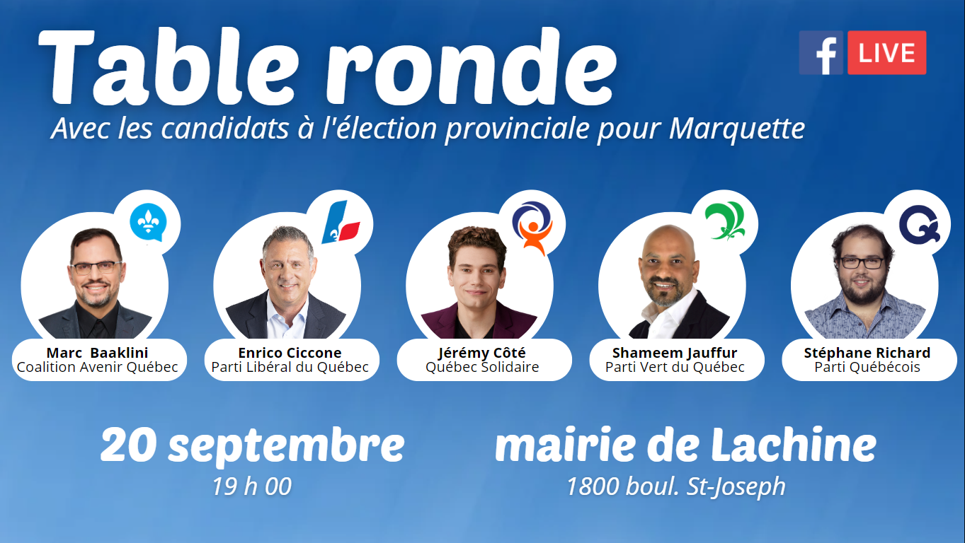Tous les citoyens sont invités à la table ronde le 20 septembre à 19h à la mairie de Lachine, au 1800, boulevard Saint-Joseph, à Lachine.