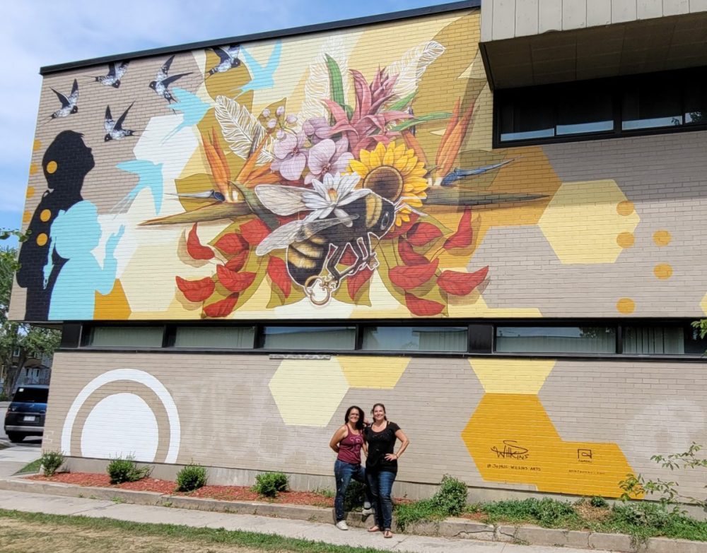 Sur la murale, des fleurs «qu’on peut trouver sur chaque continent» sont peintes pour représenter le sens de la communauté. L’abeille tient une clé, car «le travail d’équipe, la communauté, c’est la clé», explique la peintre.
