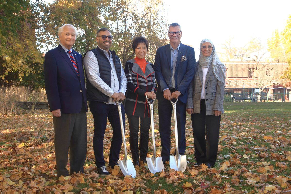 Madame Manon Barbe entourée des coprésidents de la campagne majeure de financement, Monsieur Gino Melatti jr et Jean-François Cromp, et des représentants du CIUSSS-ODIM, Monsieur Richard Legault et Madame Najia Hachimi-Idrissi lors de la pelletée de terre de début des travaux. Photo: Gracieuseté, Maison des soins palliatifs Sault-Saint-Louis