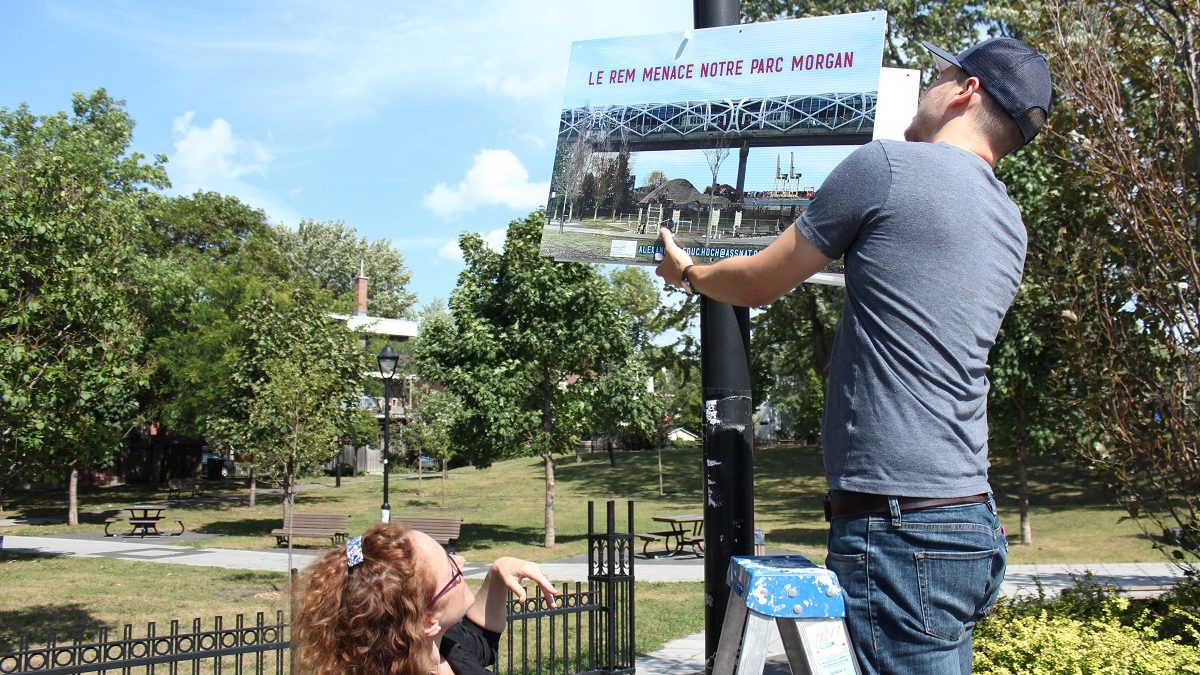 Cette campagne d’affichage a entre autres pour objectif de conscientiser la population de l’impact du REM de l’Est sur le parc Morgan. Photo: Jason Paré/Métro Média