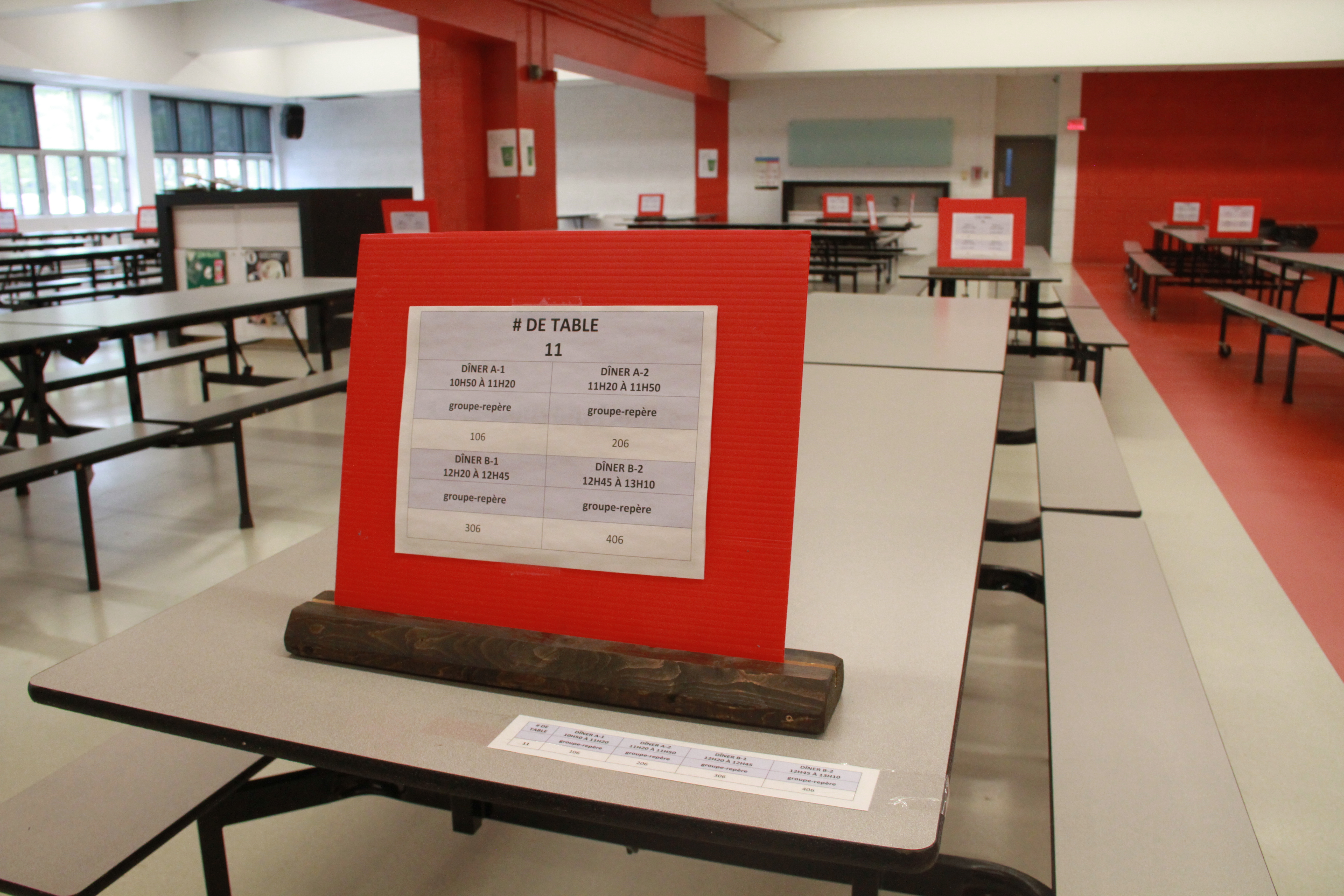 Afin de respecter les normes sanitaires, l’heure du dîner à la cafétéria laquelle ne peut désormais qu’accueillir un maximum de 250 éleves y a été scindée en quatre périodes. Chacune des tables est assignée à une bulle-classe déterminée.