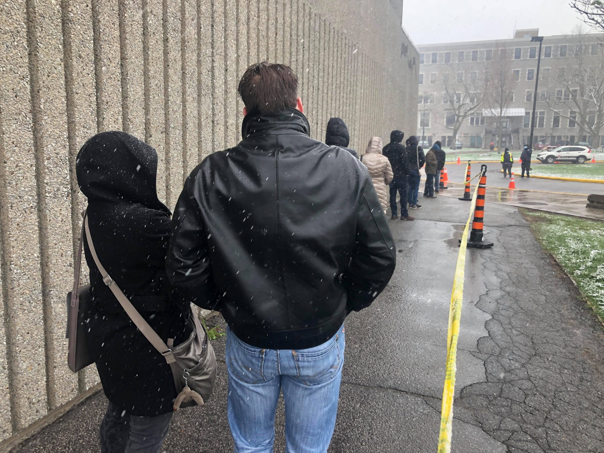 Éric, 49 ans, attend depuis 5 minutes sous les flocons. À ce rythme, il sera à l’intérieur dans une dizaine de minutes. Il est excité de recevoir aussi rapidement l’AstraZeneca ce matin.