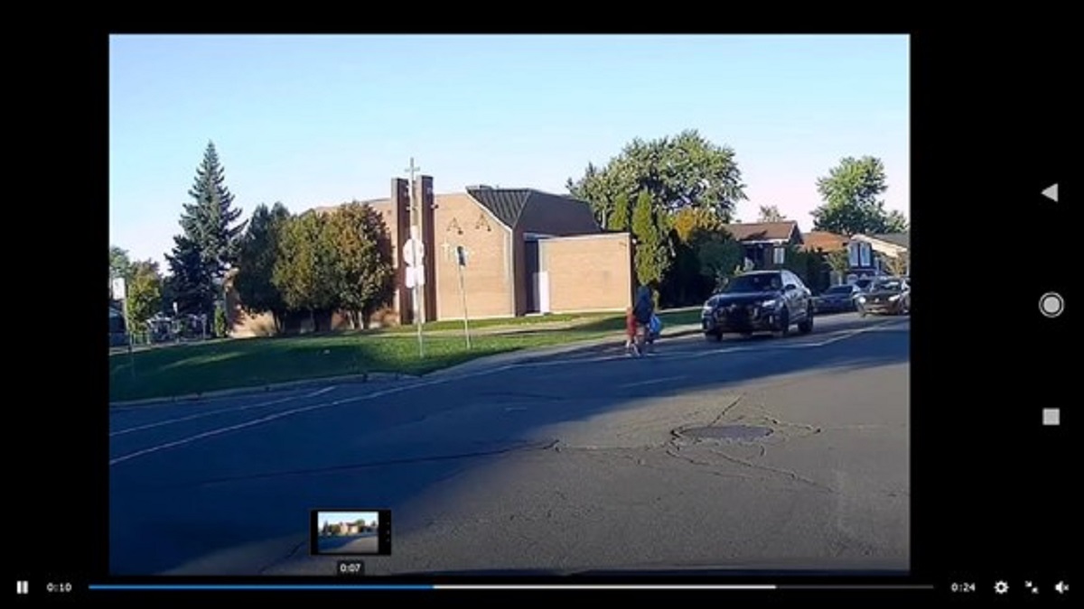 Sur celle-ci, on peut voir les deux piétonnes traverser la route ainsi qu’un VUS noir s’approcher de l’intersection. Même s’il manœuvre lentement, le VUS ne s’arrête simplement pas avant le passage piétonnier et heurte l’adulte et l’enfant qui y marchent. Elles sont propulsées au sol. Le VUS s’arrête et quelques secondes plus tard, le conducteur en sort, puis la vidéo se termine.