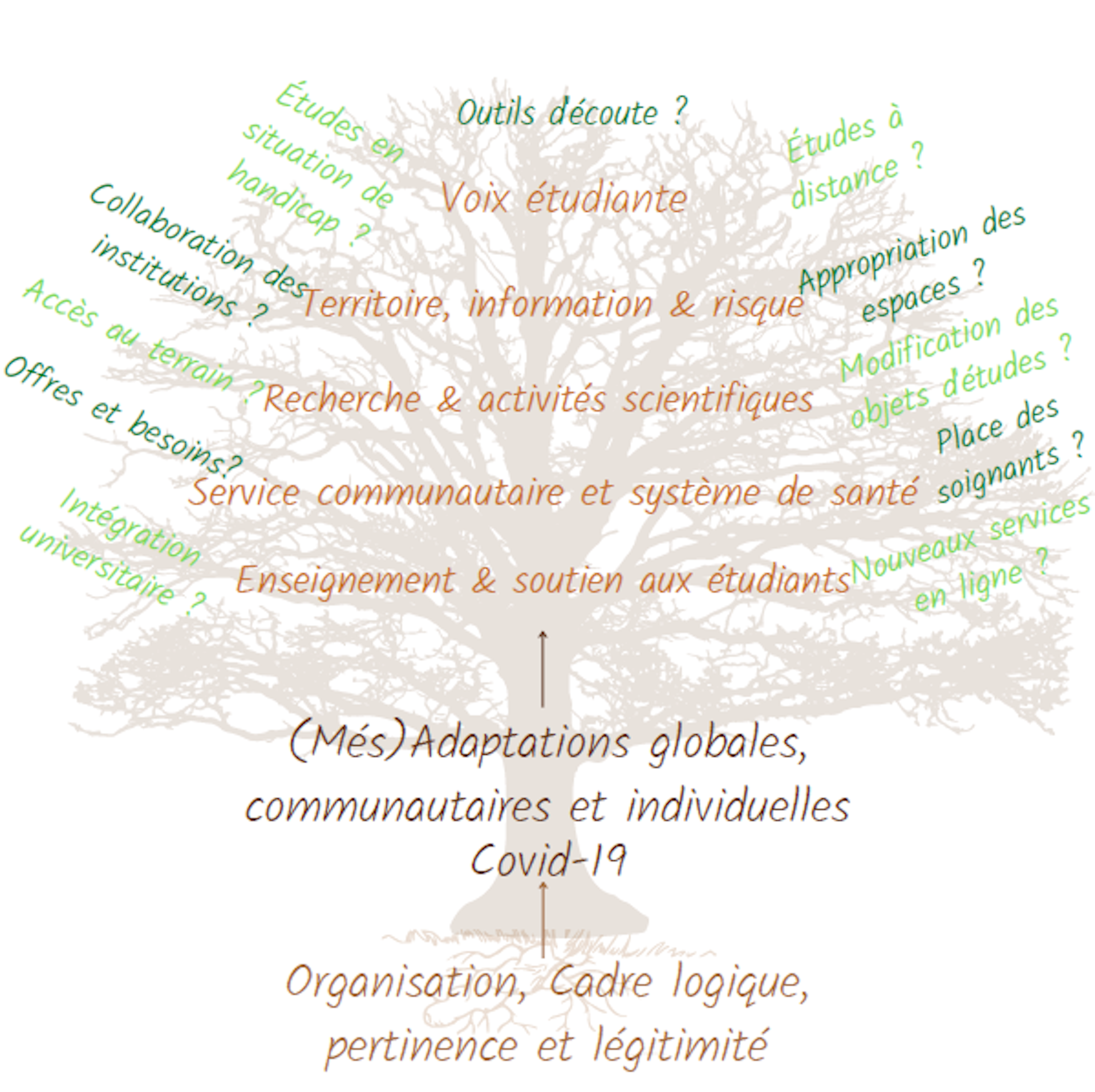 Nous l’avons fait à travers un arbre à problèmes reliant les axes transversaux (comme un tronc) et le côté spécifique à chaque thème (comme des racines liées au tronc). Nous avons aussi matérialisé les ramifications et les sous-questions (ramifications finales de l’arbre) qui seraient vraiment efficaces pour créer de l’intérêt, offrir des possibilités d’échange et mettre en avant les différences disciplinaires par le croisement d’idées et d’observations.
